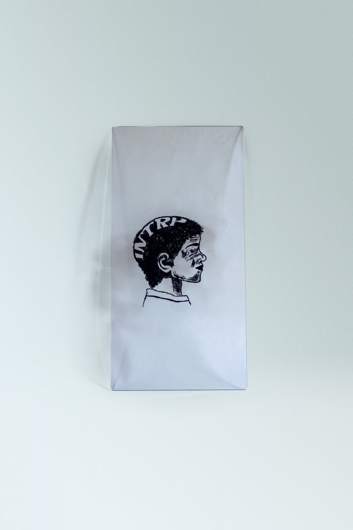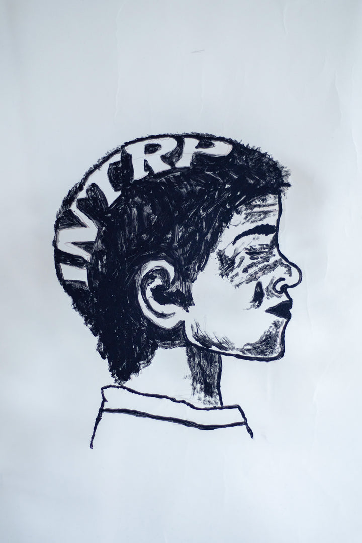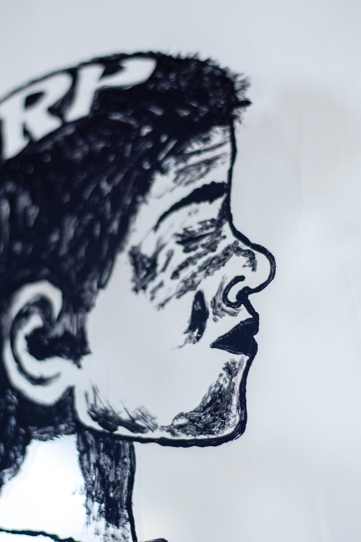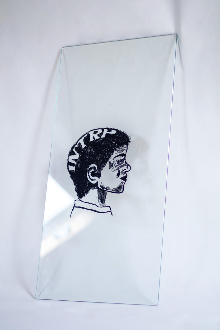 Bemalte Glasscheibe mit schwarzer Acrylfarbe. 1nterrupted Kid Design in der Mitte. Durchsichtig und perfekt als Zimmerdekoration. Gemalt von MBK.