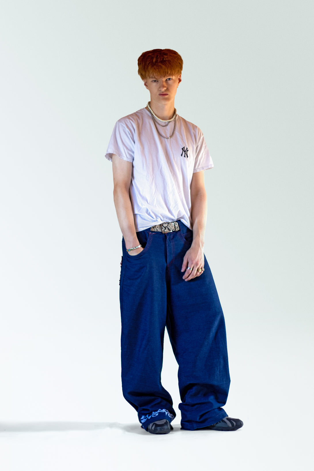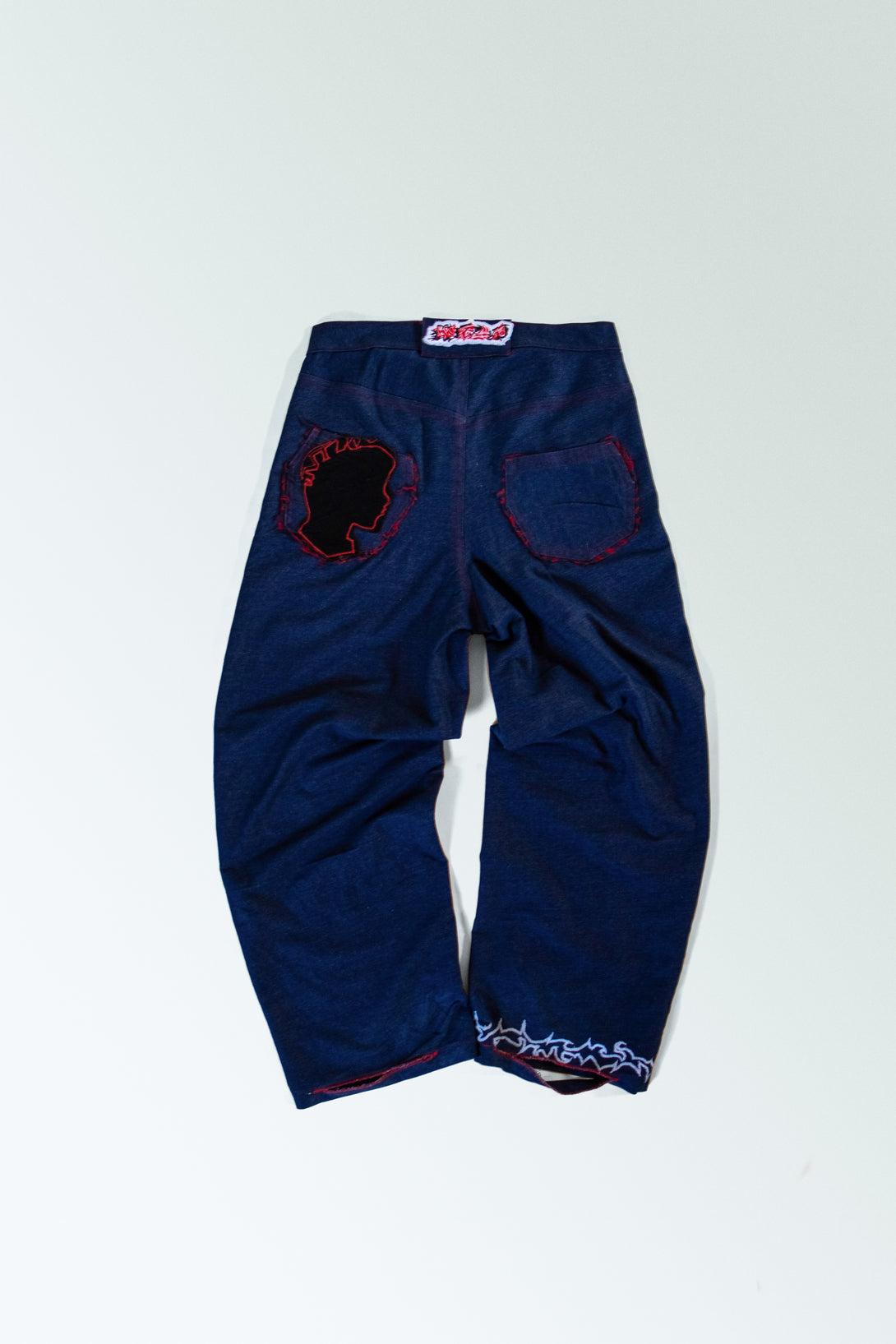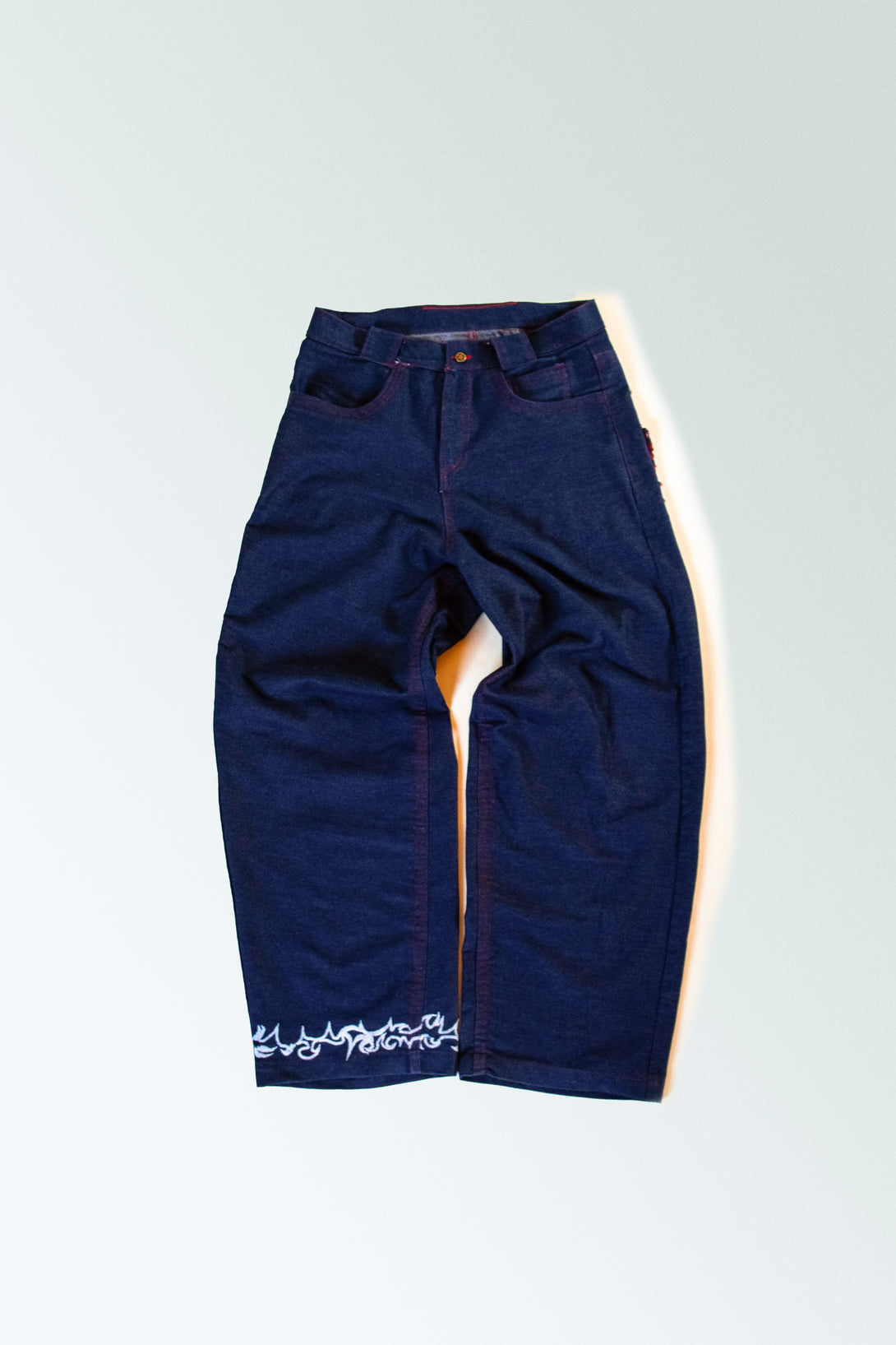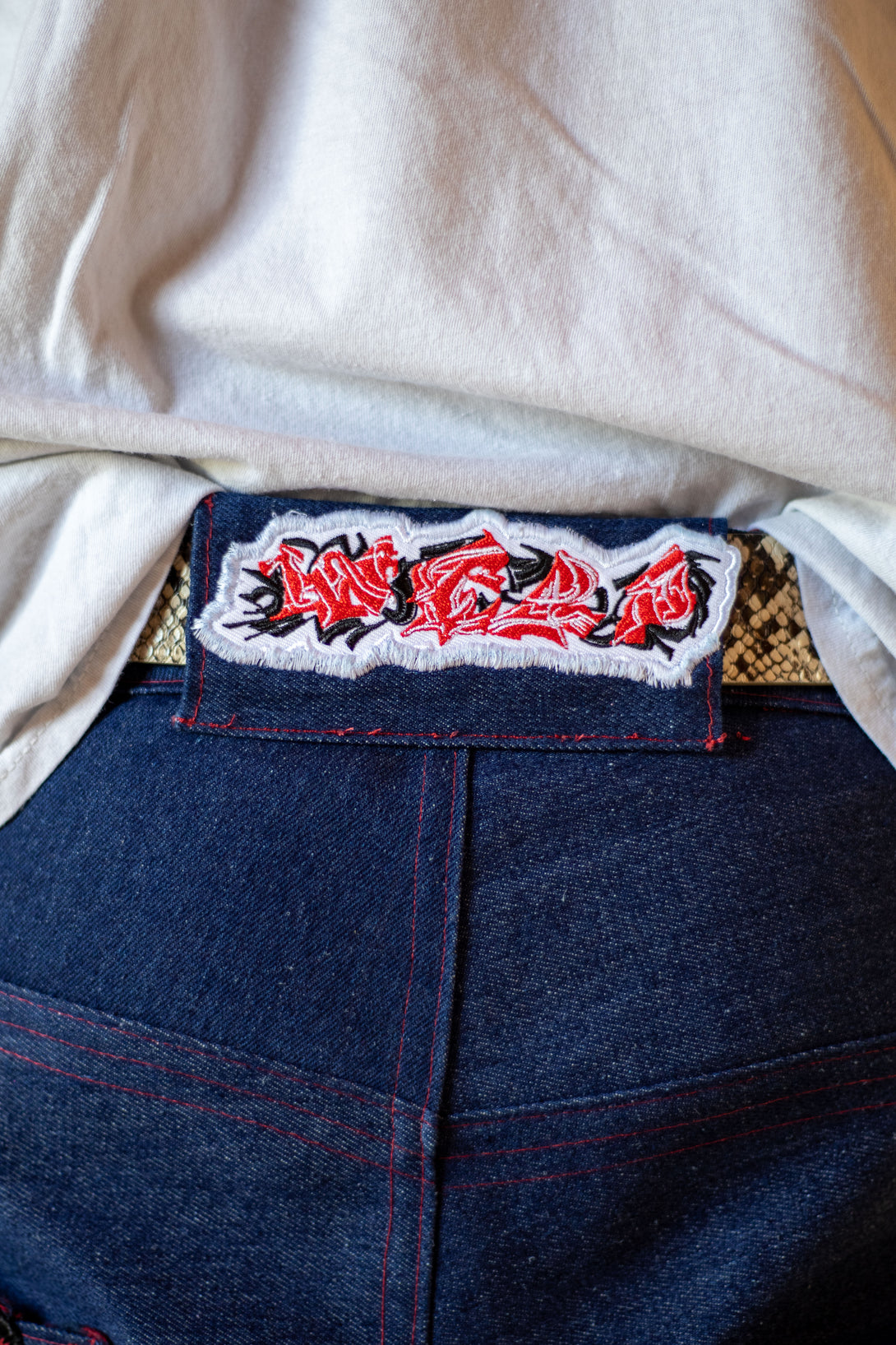 Raw Jeans im Baggy Fit. Oldschool Passform mit vergrößertem Saum. Breite Gürtelschlaufen und handgestickte Dornen am rechten Bein. Ausgefranßter Karostoff unter beiden Gesäßtaschen und Interrupted Kid Logo auf der linken Gesäßtasche.