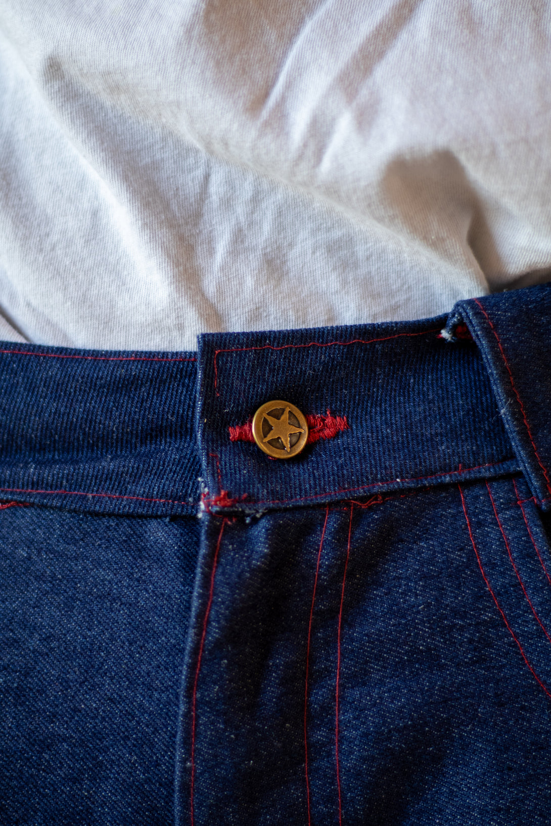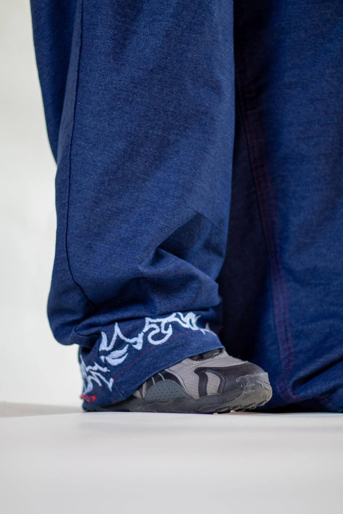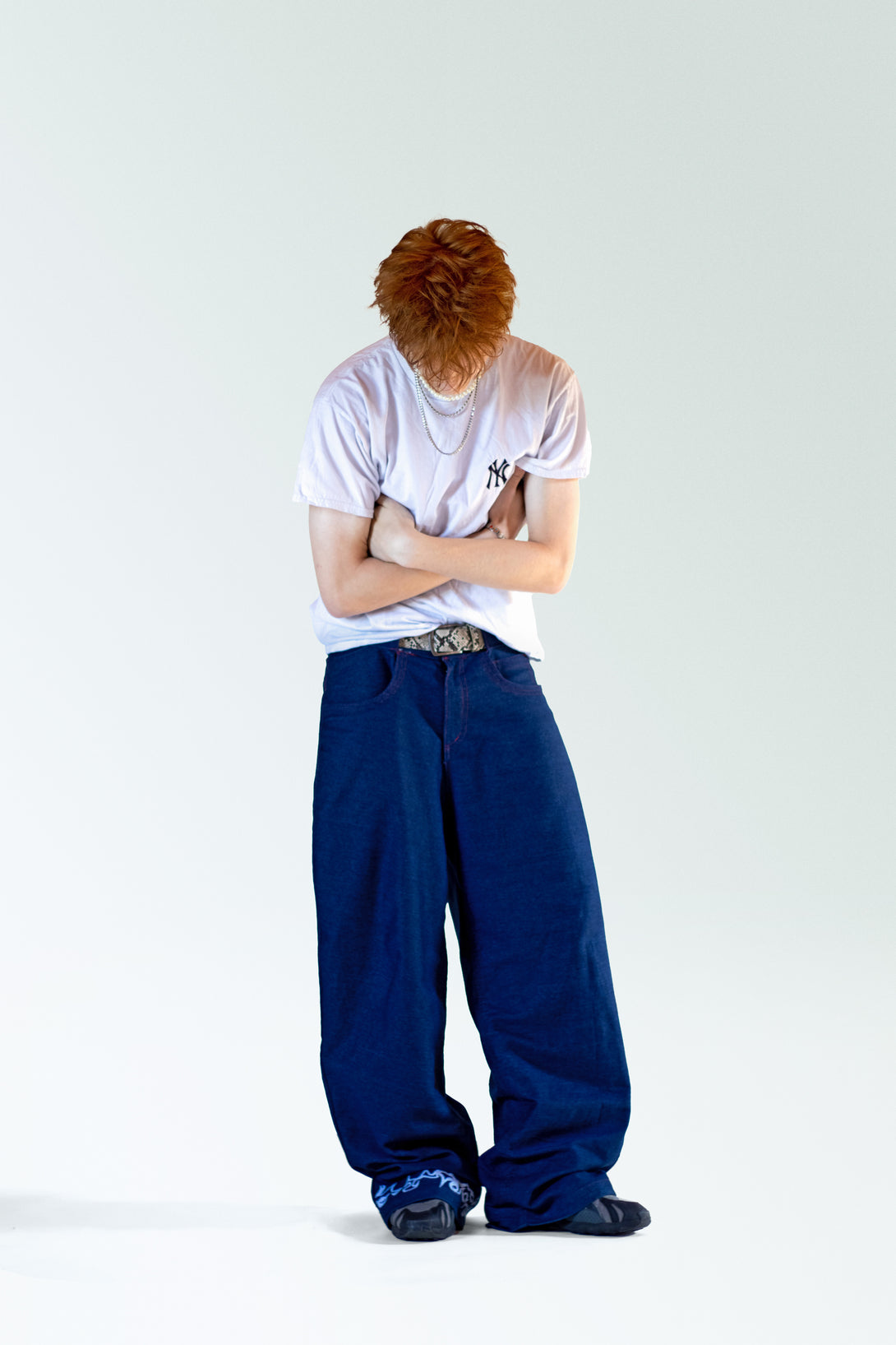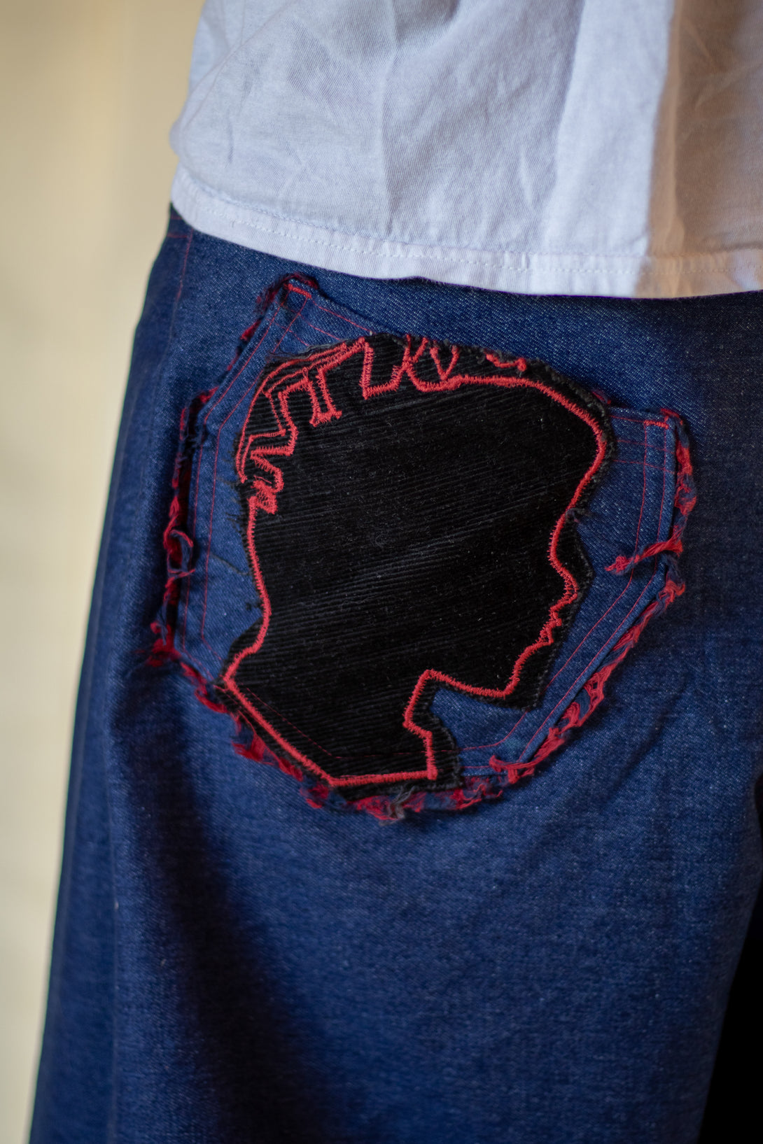Raw Jeans im Baggy Fit. Oldschool Passform mit vergrößertem Saum. Breite Gürtelschlaufen und handgestickte Dornen am rechten Bein. Ausgefranßter Karostoff unter beiden Gesäßtaschen und Interrupted Kid Logo auf der linken Gesäßtasche.