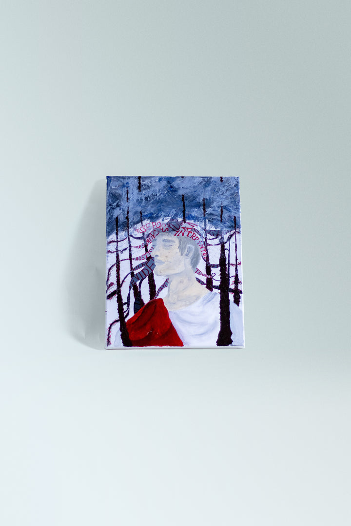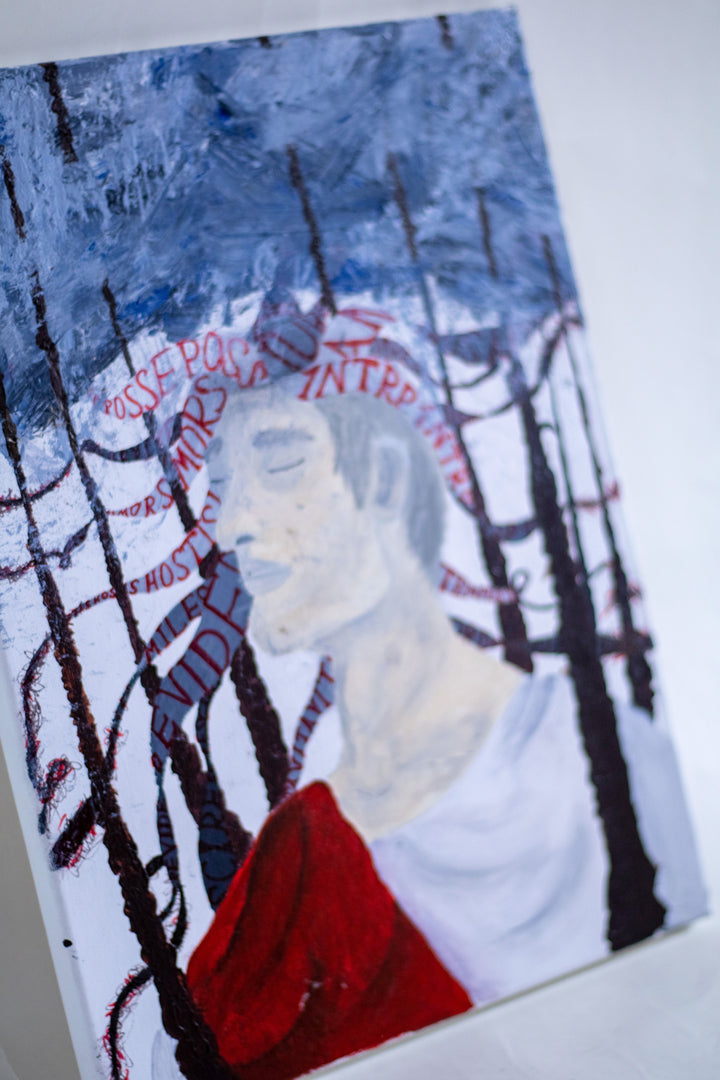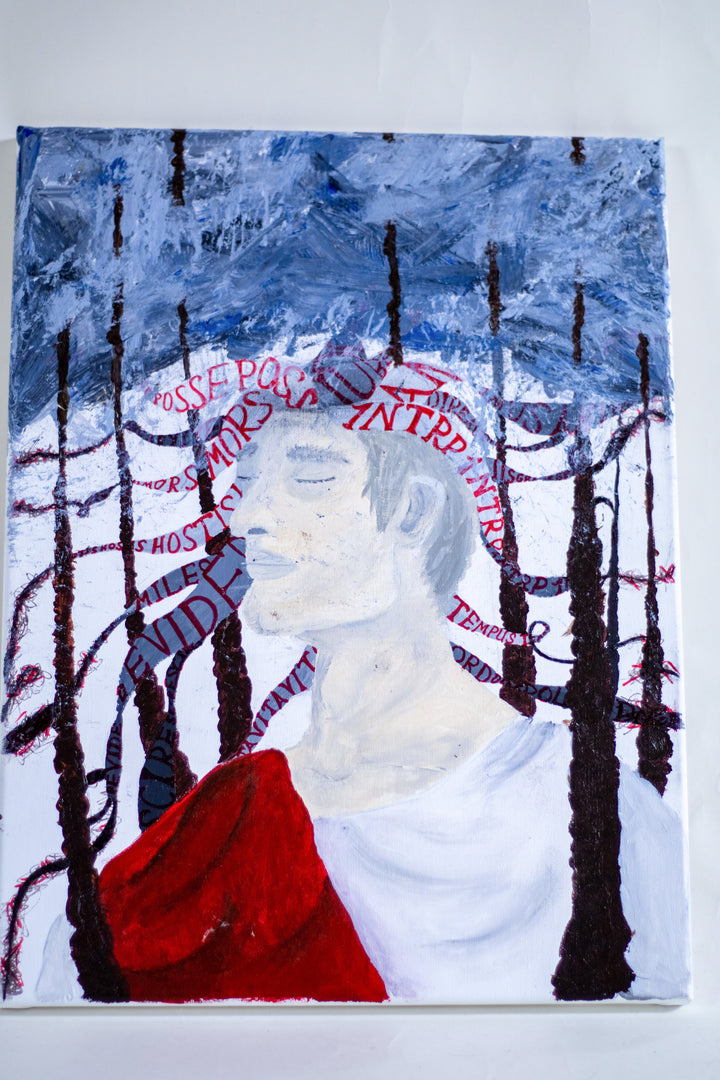 Bemalter Keilrahmen. Caesar Statue mit Schriftrollen voller Lateinischer Begriffe, welche sich unaufhaltsam aus seinem Kopf verbreiten. Gewitter über Statue mit Marionettenseilen, die sie kontrollieren. Gemalt von MBK.